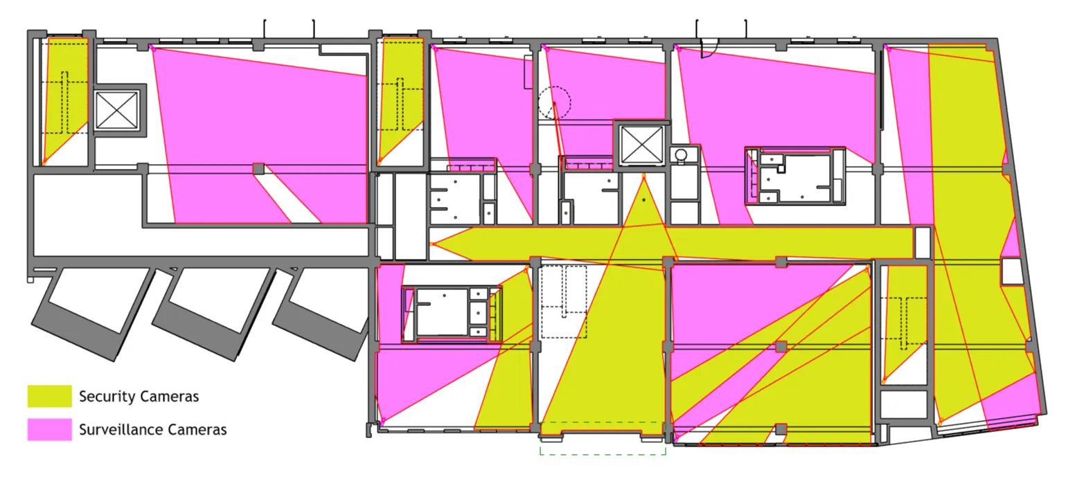 Each camera generates filled regions that clearly show what the camera can see, helping you quickly identify blind spots, overlaps, and over-coverage.
