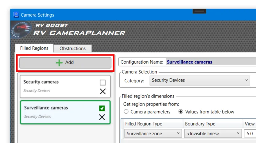 Security designs often include a mix of cameras with different roles. RV CameraPlanner lets you vary filled region settings by camera type.