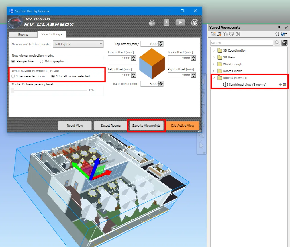 If you want to save only one single viewpoint for all the selected rooms, switch to the View Settings tab and select “1 view for all rooms selected”. Next, click “Save to Viewpoint” again to finish creating the view: